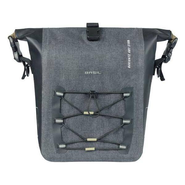 Die Tasche ist aus hochwertigem, wasserdichtem (IPX3) Material gefertigt. Dank des funktionalen Designs passt alles, was du brauchst, problemlos hinein. Alles ist darauf ausgelegt, dir den Transport deiner Sachen so praktisch wie möglich zu machen. Dank des verstellbaren elastischen Kordelzugs findet beispielsweise eine Jacke Platz, und die Tasche lässt sich mit dem Rollverschluss einfach verschließen. Dieser Rollverschluss lässt sich auf drei verschiedene Arten befestigen. Unterwegs im Dunkeln? Kein Problem! Mit den reflektierenden Basil-Logos an drei Seiten bist du auch dann gut sichtbar. So bist du immer vorbereitet.