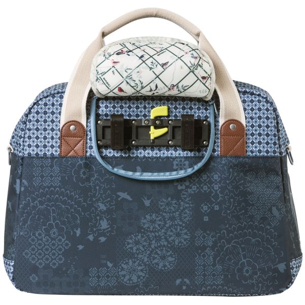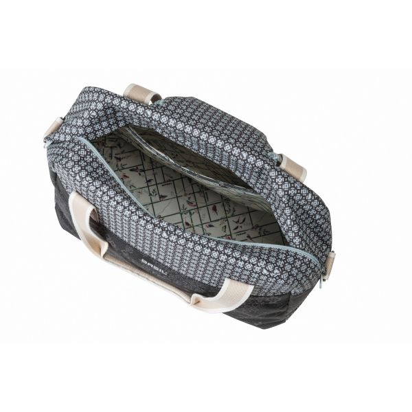 Die Basil Bohème Fahrrad-Umhängetasche ist eine einzelne grüne Fahrradtasche, die stilvoll aussieht und zudem sehr einfach zu handhaben ist. Die Tasche hat ein Fassungsvermögen von 18 Litern, und der Boho-Print sorgt für einen eleganten Look. Dank des Hook-On-Systems ist die Tasche mit vielen Gepäckträgern (auch E-Bikes) kompatibel und lässt sich einfach am Gepäckträger befestigen. Dieses System ist in einem separaten Reißverschlussfach versteckt. Die Tasche hat zwei Tragegriffe und einen abnehmbaren Schultergurt, sodass du sie als Umhängetasche, Handtasche oder Fahrradtasche verwenden kannst. Ob Radtour zum Supermarkt oder Mittagessen mit Freunden – diese Fahrradtasche rundet deinen (Boho-)Look ab und macht das Radfahren einfacher. Die Tasche verfügt über eine Innentasche, ein robustes Futter, Kunstlederdetails und einen Reißverschluss. Dank des wasserabweisenden Polyesters bleibt der Inhalt der Tasche auch bei leichtem Regen trocken. Reflektierende Details auf beiden Seiten sorgen für bessere Sichtbarkeit im Dunkeln. Die Basil Bohème Carry All ist in verschiedenen Farben erhältlich, darunter Rot und Blau. Du magst es gerne kombinierbar? Dann sieh dir auch die passenden Boho-Sattelbezüge und Fahrradklingeln an.