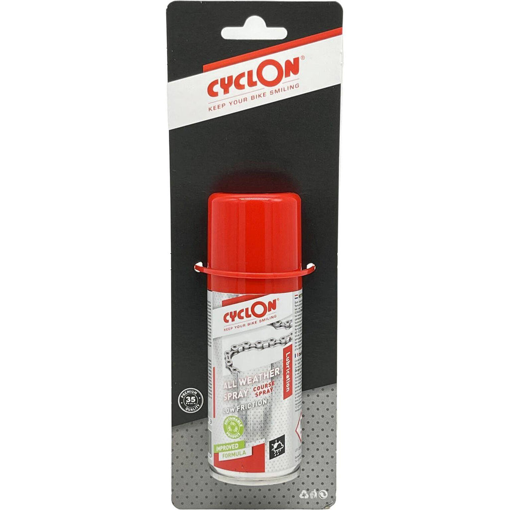 Allwetter-Spray! Weniger Reibung, besserer Schutz, weniger Schmierintervalle und lange Haltbarkeit! Verwenden Sie CyclOn Allwetter-Spray zum Schmieren Ihrer Kette. Dieses langlebige Schmiermittel ist reibungsarm und kann bei jedem Wetter verwendet werden. Es sorgt für einen leichtgängigen Antrieb und eine langanhaltende Schmierung Ihrer Kette.