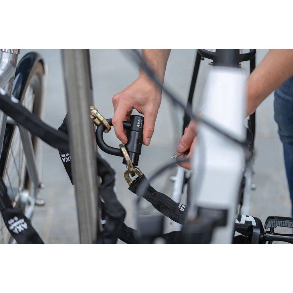 Das AXA Loop 110 ist eine zugelassene (ART 2-Stern) Kette mit separatem Vorhängeschloss, die sich ideal zur Sicherung eines teuren (Elektro-)Fahrrads oder Lastenrads eignet. Der Zylinder ist durch eine Abdeckung geschützt, die das direkte Eindringen von Feuchtigkeit und Schmutz verhindert. Dies erhöht die Langlebigkeit des Schlosses. Die robuste schwarze Polyesterabdeckung verhindert Beschädigungen.