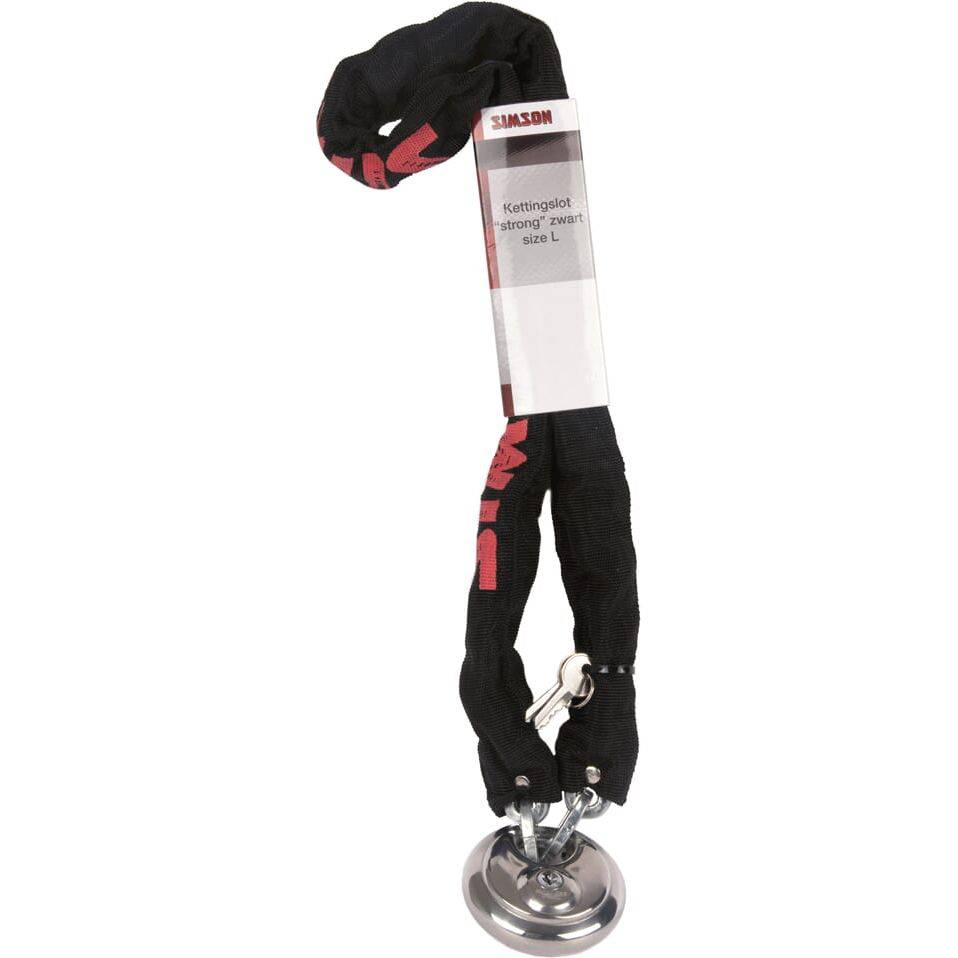 Das Simson Strong Chain Lock, Größe L, ist ein sicheres schwarz-rotes Kettenschloss mit einer Stärke von 5,5 mm. Mit einer Länge von 1 Meter lässt sich das Schloss bequem am Fahrrad mitführen. Die Kette wird mit einem robusten Scheibenschloss und zwei Schlüsseln geliefert.
