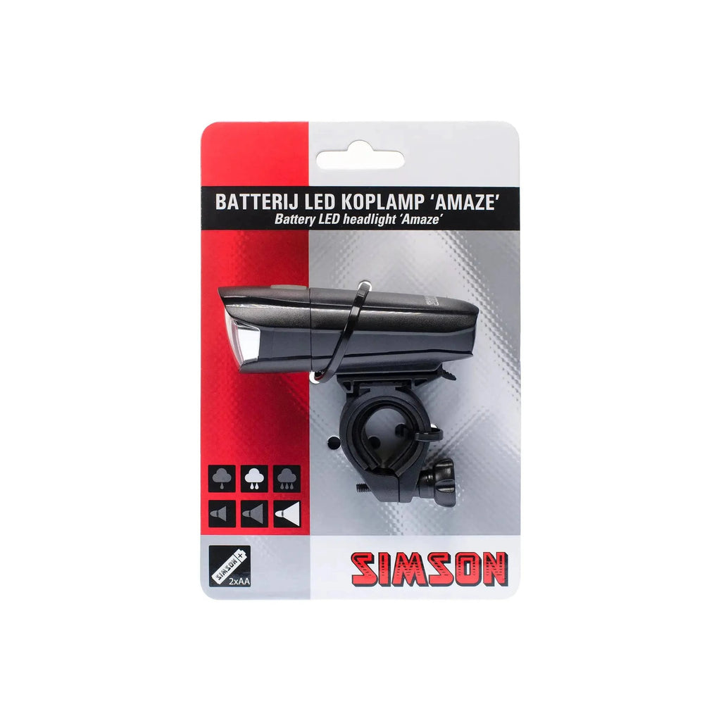 Der Simson "Amaze" Batterie-LED-Scheinwerfer ist ein leistungsstarker Scheinwerfer mit Kunststoffgehäuse und Lenkerhalterung. Die LED erzeugt einen sehr hellen Lichtstrahl mit einer Leistung von 25 LUX! Der batteriebetriebene Scheinwerfer mit Reflektor verfügt über einen leicht bedienbaren Druckknopf mit Ein-, Aus- und Blinkfunktion. Der mitgelieferte Montagering ermöglicht eine einfache und werkzeuglose Montage des Scheinwerfers am Lenker mittels Schraubverschluss. Anschließend lässt sich das Fahrradlicht einfach in den Montagering ein- und ausklicken. Inklusive 2 x AA-Batterien.