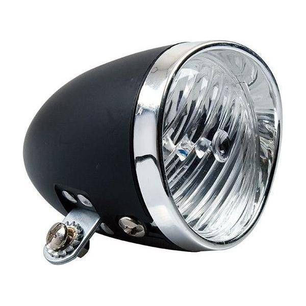 Klassisch aussehende Stirnlampe mit einer einzelnen, ultrahellen weißen LED. Die Lampe verfügt über einen großen Ein-/Ausschalter und wird mit den mitgelieferten Batterien betrieben.