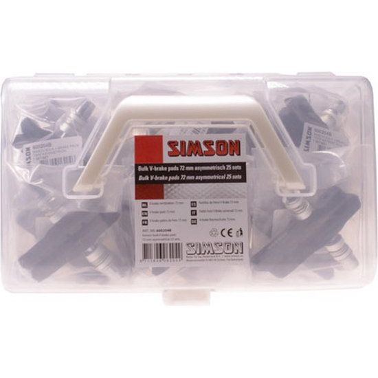 Simson Bulk V-Brake-Beläge werden in 25er-Sets in einer praktischen, tragbaren Aufbewahrungsbox geliefert. Die Beläge sind 72 mm breit und asymmetrisch. Jedes Set ist einzeln verpackt und mit einem individuellen Barcode versehen, sodass sie gescannt werden können. Die Beläge sind mit dem Simson-Logo und einer Rechts-/Links-Markierung versehen, was die Montage erleichtert. Die weiche Mischung der Beläge sorgt für hervorragende Bremskraft.