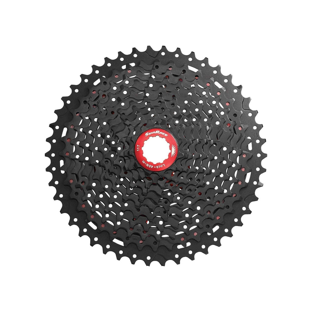 11-fach Sunrace Kassette, geeignet für Shimano/Sram-Körper. Spezifikationen: Anzahl der Gänge: 11 Verzahnung: 11-46 (11-13-15-18-21-24-28-32-36-40-46) Farbe: schwarz mit rotem Spider und Verschlussring Material Kettenrad 1-10: hochfester Stahl Material Kettenrad 11: A7075 Aluminium/eloxiert Gewicht: 465 Gramm