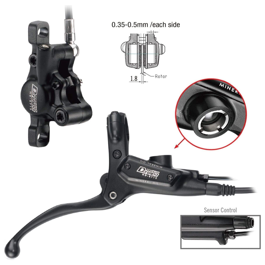 Hydraulische Scheibenbremse mit Bremssensor für E-Bikes. Das ist der richtige Bremssatz. Offenes System, Doppelkolben. Sensorsteuerung entwickelt. Hohe Leistung, für 45 km/h schnelle E-Bikes entwickelt. Einfache Installation, Einstellung und Wartung. Hebel Hebel aus geschmiedetem Aluminium / Haken aus Aluminiumguss Sichtbarer Behälter 2-teilige Halterung für einfache (De-)Montage 4-Finger-Bremshebel mit Finish: Schwarz Bremssattel Gehäuse aus geschmiedetem Aluminium Freier Winkel der Schlauchkupplung für Passform an verschiedene Rahmen Großer Abstand zwischen den Bremsbelägen Einfacher Belagwechsel von oben Finish: Schwarz Postmount Bremsbeläge Metall-Keramik-Verbindung Einfacher Wechsel Verfügbar: Langlebiger gesinterter Belag A11TS Adapter-Bremssattel-Montagemaße 74,2 mm - Internationaler Standard. Bremsflüssigkeit Flüssiges, nicht korrosives Mineralöl Hervorragende Wärmeausdehnungseigenschaften Gewicht Gewicht Vorderradbremssatz – 348 Gramm / Hinterradbremssatz – 384 Gramm