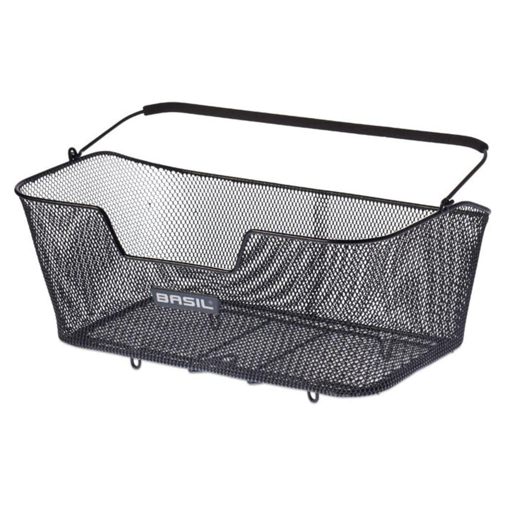 De Basil Base XL is een zwarte afneembare fietsmand voor achterop voorzien fijnmazig staal, beschermvoetjes, slotbevestigingsmogelijkheid, geschikt voor bagagedragers met veerklem.