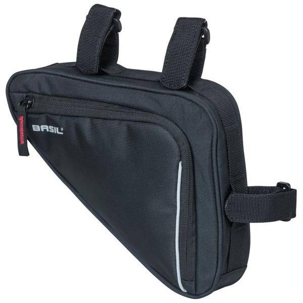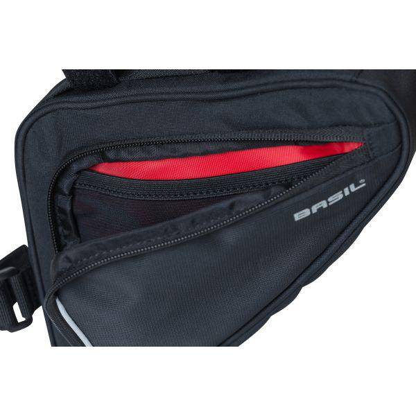 La sacoche de cadre triangulaire Basil Sport Design M est une sacoche de vélo pratique pour tous ceux qui aiment se déplacer à vélo. Fonctionnelle et pratique, elle se fixe facilement au cadre de votre vélo grâce à sa fermeture Velcro. Fabriquée en polyester déperlant, cette sacoche noire est dotée d'un compartiment principal avec une poche filet et un mousqueton. C'est un moyen pratique d'y attacher vos clés, par exemple. D'une capacité totale de 1,7 litre, elle peut accueillir un antivol et est équipée de sangles élastiques pour une pompe à vélo. Vous pouvez également y ranger d'autres accessoires de vélo. Une poche latérale zippée séparée est également présente. Des éléments réfléchissants vous rendent plus visible, que vous enfourchiez votre vélo tôt le matin ou que vous rentriez chez vous à vélo la nuit tombée.