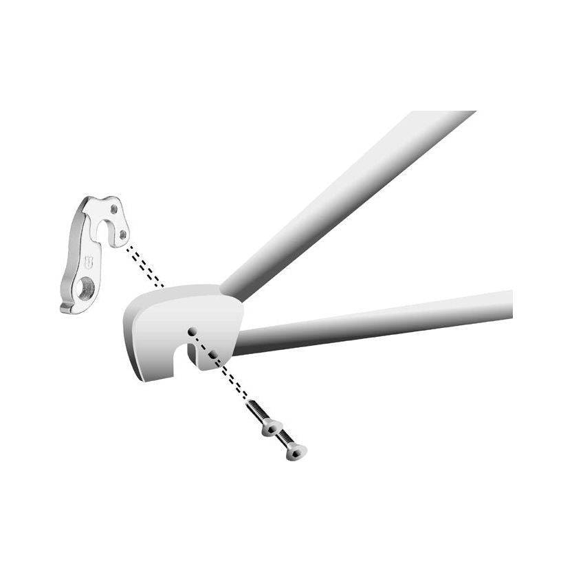 Patte de dérailleur en aluminium, compatible notamment avec les marques de vélos suivantes : Ghost. Matériau : aluminium AL 6061, forgé à froid. Contenu de la livraison : patte de dérailleur avec vis de fixation.