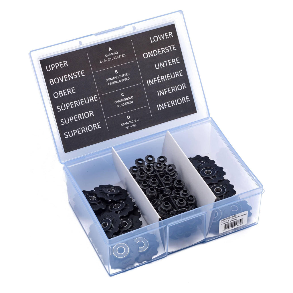 Voordeelverpakking met derailleurwieltjes van Elvedes met 2x 11 tanden, voorzien van standaard afgedichte lagers. Geschikt voor onder andere Shimano, Campagnolo en Sram Spacer specificaties: A: Past Shimano® 8/9/10/11 speed B: Past Shimano® 7 speed, Campagnolo® 8 speed C: Past Campagnolo® 9/10 speed D: Past Sram® 7.0/9.0 97 - 99