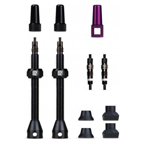- 2 complete tubeless ventielen (inclusief: zwarte ventielkernen, ultralichte ventieldoppen, rubber aansluitingen, o-ringen en sluitringen
