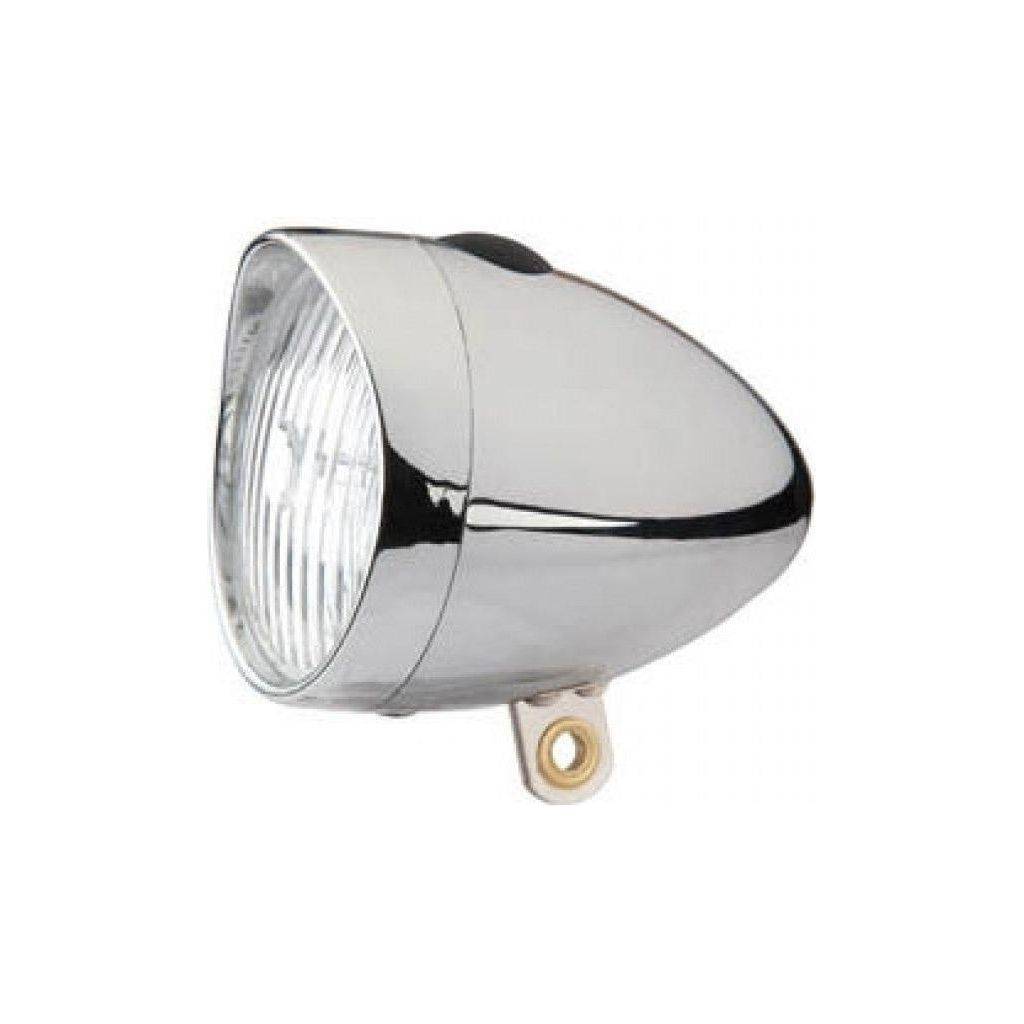 De Edge Retro koplamp is de ouderwetse koplamp in nieuw jasje. Deze koplamp is uitgerust met een 3 sterke witte leds die zorgen voor heldere verlichting op de weg. Deze voorlamp monteer je eenvoudig op de bestaande haak van je voorvork. Het voorlicht werkt op batterijen; die worden meegeleverd. Produktspecifikaties: 3 heldere LEDs Functies: Aan - Uit Kleur: Chroom Inclusief batterijen ( 3 * AAA) Lichtsterkte: 11 Lux - 28 Lumen Waterproof; IPX3 Produktafmeting: 75*91*98mm Gewicht: 114 gram