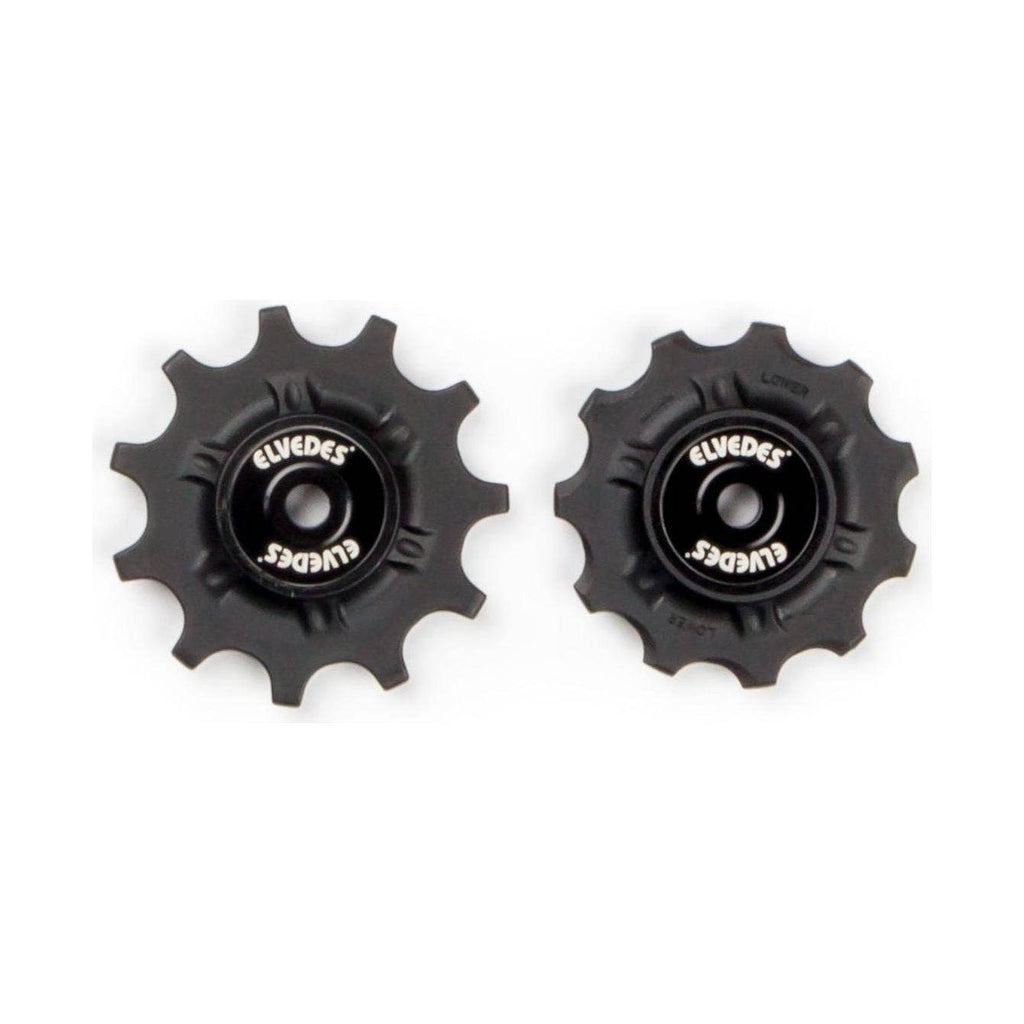 Poulies de dérailleur Elvedes avec 2 x 11 dents, équipées de roulements étanches en acier inoxydable. Adaptées notamment aux dérailleurs suivants : Shimano 9/10/11 vitesses VTT et route SRAM X0/X9/X7 9 vitesses VTT à partir de 2011 et X0/X9/X7 10 vitesses VTT SRAM Apex/Rival/Force 10 vitesses route (utiliser une bague pour boulon de 4 mm) Campagnolo 11 vitesses route