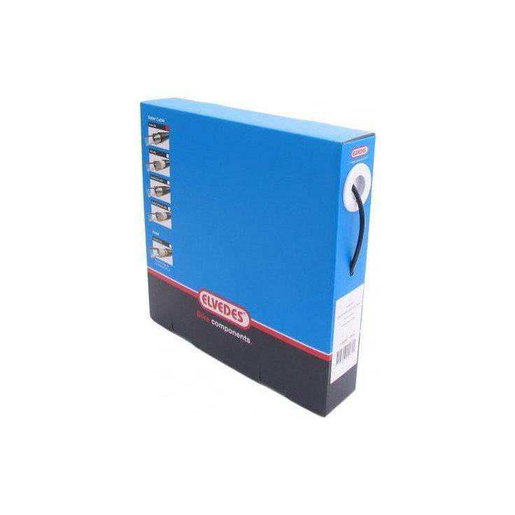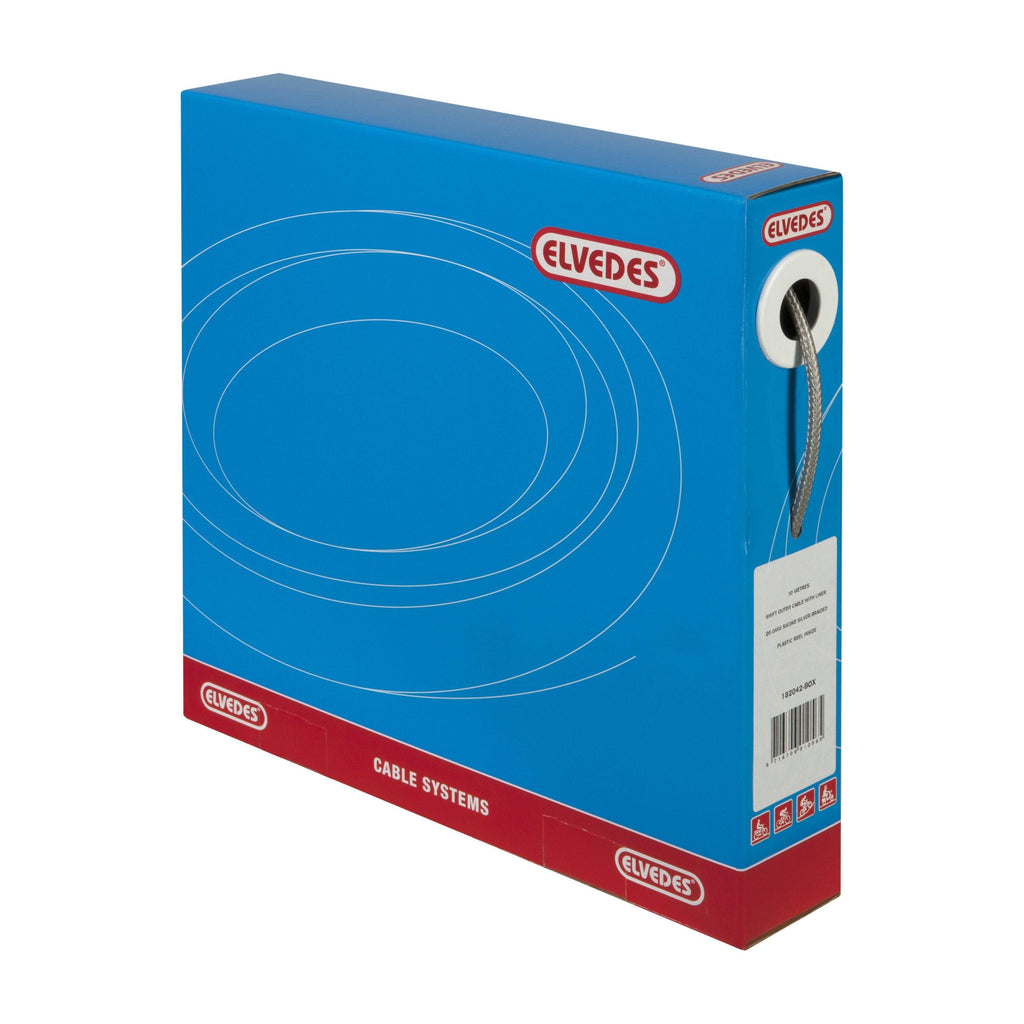 Werkplaatsdoos met Elvedes schakel buitenkabel. De doos is voorzien van een handig GripClip mondstuk wat ervoor zorgt dat de kabel niet terug in de doos glijdt. 30 meter op rol in doos Ø5,0mm Met teflonvoering Gevlochten buitenmantel Rookzilver