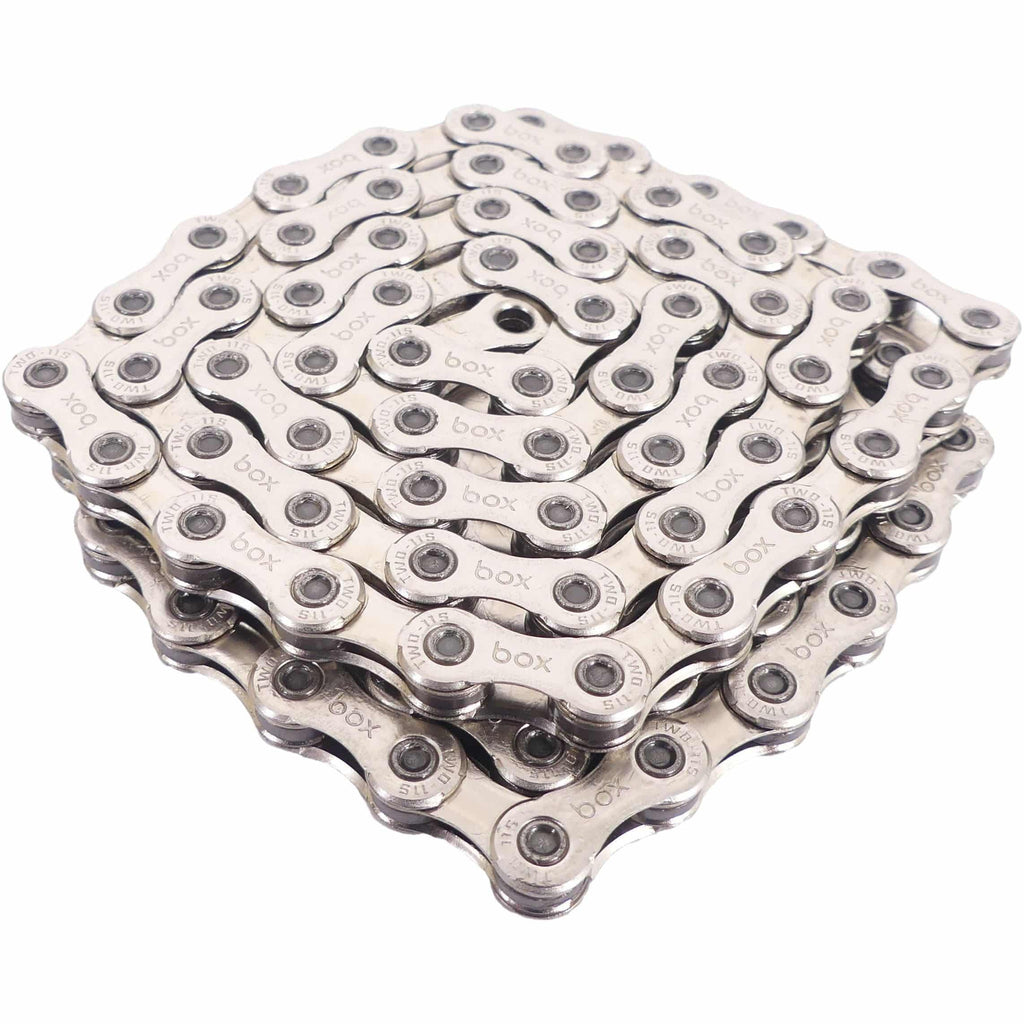 Snelheden 11 & Box 7 DH Warmtebehandeld gelegeerd staal 126 schakels Binnenplaat vast Buitenste plaat vast Zware kwaliteit schakelpinnen Afwerking nikkel Gewicht 276 gram