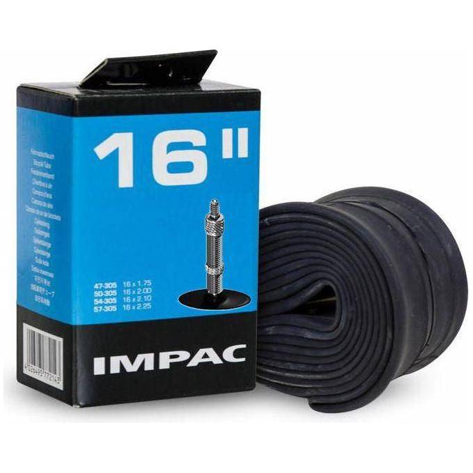Chambre à air Impac, fabriquée par Schwalbe. Livrée dans un emballage carton. Caractéristiques du produit : Vanteau : Dunlop 26 mm. Compatible avec les tailles de pneus suivantes : - 47-305, 16x1.75" - 50-305, 16x2.00" - 54-305, 16x2.10" - 57-305, 16x2.25"