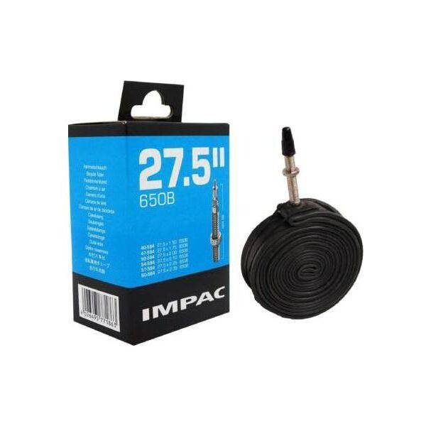 Chambre à air Impac, fabriquée par Schwalbe. Livrée dans son emballage carton d'origine. Spécifications : Vente : Vente française 40 mm. Compatible avec les tailles de pneus suivantes : - 40-584, 27.5x1.50", 650B - 47-584, 27.5x1.75", 650B - 50-584, 27.5x2.00", 650B - 54-584, 27.5x2.10", 650B - 57-584, 27.5x2.25", 650B - 60-584, 27.5x2.35", 650B