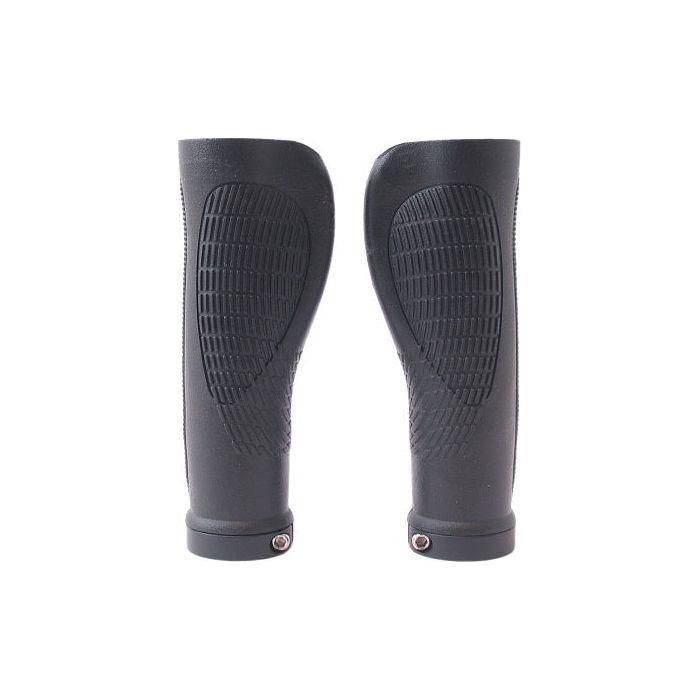Le jeu de poignées ergonomiques GP03L, avec un design bi-composants noir, mesure 128 mm de long de chaque côté et est livré avec un anneau de blocage. Ces poignées sont conçues pour offrir confort et adhérence lors du cyclisme. Le matériau bi-composants assure un bon compromis entre durabilité et confort, tandis que le design ergonomique privilégie une position naturelle des mains pendant le cyclisme.