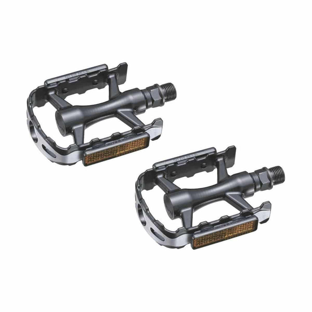 Een fietspedaal met een robuuste gegoten aluminium ashuis en kooi, speciaal ontworpen voor trekking- en ATB fietsen. FUNCTIES Onderhoudsvrije lagersysteem zorgt voor een wrijvingsloze beweging De pedalen zijn elk aan twee kanten voorzien van goedgekeurde reflectoren en een gesloten lagering TECHNISCHE INFORMATIE Type pedaal "Aluminium pedaal (uit één stuk)", dat bestaat uit: Een gegoten aluminium ashuis en kooi, gemaakt van een gezandstraald en zwart gelakt (ED black) aluminum CNC frezing, zilver afgewerkt Kogellager Een onderhoudsvrij lagersysteem "industriestandaard", aan beide zijden Elk pedaal is voorzien van één onderhoudsvrije (cartridge) lager en één glijlager As CrM0-staal, door middel van een hitte behandeling gehard tot 75HRA (+/-3) Met 9/16"- 20 TPI draad Reflectoren Reflectoren aan beide zijden van de kooi van het pedaal, vastgezet d.m.v. een kliksysteem Goedgekeurd volgens BS, JIS, TPP, alsmede volgens de Duitse StVZO normen (K369) Afmetingen 102* x 78 x 23 mm (*lengte x breedte x hoogte) *lengte = maximale lengte pedaal gemonteerd (deel wat uitsteekt buiten het trapstel) Gewicht 272 gr/per stel Normering Het pedaal doorstond de TÜV test en voldoet aan de EN normering. EN-14766 "Veiligheidseisen en testmethode voor ATB/MTB fietsen"