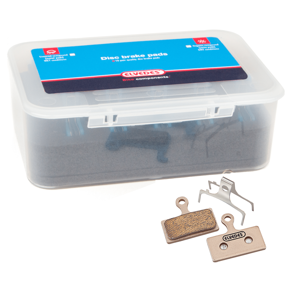 1 paire de plaquettes de frein à disque frittées pour Shimano BR-M666, M785, M985, M988, R785, RS785. La gamme Elvedes propose la quasi-totalité des plaquettes de frein à disque courantes et vous offre un excellent rapport qualité/prix. Utilisez le présentoir Elvedes Discovery en acier avec 60 compartiments dans l'atelier pour toujours avoir les plaquettes de frein adaptées à vos besoins. Composé : Les composés sont fabriqués à partir de différents matériaux. Chaque composé présente ses avantages et ses inconvénients. La gamme Elvedes propose trois composés différents offrant une puissance de freinage élevée pour chaque vélo et toutes les conditions météorologiques. Organique : Idéal par temps sec. Pour VTT, trekking et vélos de route. Fritté : Idéal par temps humide. Pour VTT. Carbone métallique (semi-métallique). Idéal par temps sec et humide. Pour vélos électriques. Durée de vie : Après l'installation des nouvelles plaquettes de frein, il est très important de les roder afin de prolonger leur durée de vie. Rodage Comment prolonger la durée de vie de vos plaquettes de frein à disque : Le rodage de plaquettes neuves prolongera considérablement leur durée de vie ! Maintenez le levier de frein légèrement tiré pendant que vous roulez et assurez-vous que les plaquettes de frein touchent le disque. Roulez sur environ 100 mètres à une vitesse de 25 km/h et freinez un peu plus fort à la fin pour réduire la vitesse à environ 5 km/h. Augmentez ensuite lentement la vitesse tout en freinant légèrement. Répétez cette opération 10 à 12 fois pour vous assurer que vos nouvelles plaquettes de frein sont bien rodées.