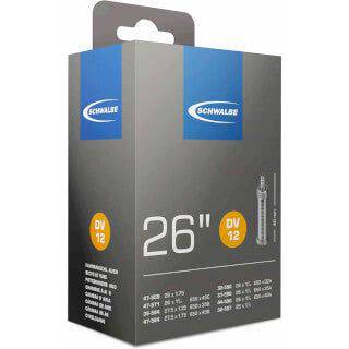 Schwalbe binnenband Standaard 26 Inch Hollands- DV12/47-559, 47-571, 30-584, 35-584, 47-584, 32-590, 37-590, 44-590, 32-597. De Schwalbe binnenbanden zijn betrouwbaar. Fietsdetaillisten waarderen hem om zijn hoge betrouwbaarheid. Iedere band wordt in de fabriek opgepompt en zo 24 uur op luchtdichtheid getest. De band houdt de luchtdruk langer vast. In de productie vereist Schwalbe een zeer hoog butyl aandeel en een zeer hoge reinheid van het materiaal. Zo houdt de Schwalbe binnenband de luchtdruk beduidend langer vast dan andere binnenbanden. Het is een groepen-binnenbandsysteem: Een Schwalbe binnenband is extreem elastisch en past op meerdere bandafmetingen. Hierdoor worden ze groepen binnenbanden genoemd. Zo past bijvoorbeeld de binnenband met nummer 19A voor bandafmeting van 27.5 inch tot 29 Inch en voor de breedte van 40 tot 62mm. Als laatste is de band 100% volledig recyclebaar. Standaarduitvoering: Hoge betrouwbaarheid, al vele jaren beproefd.
