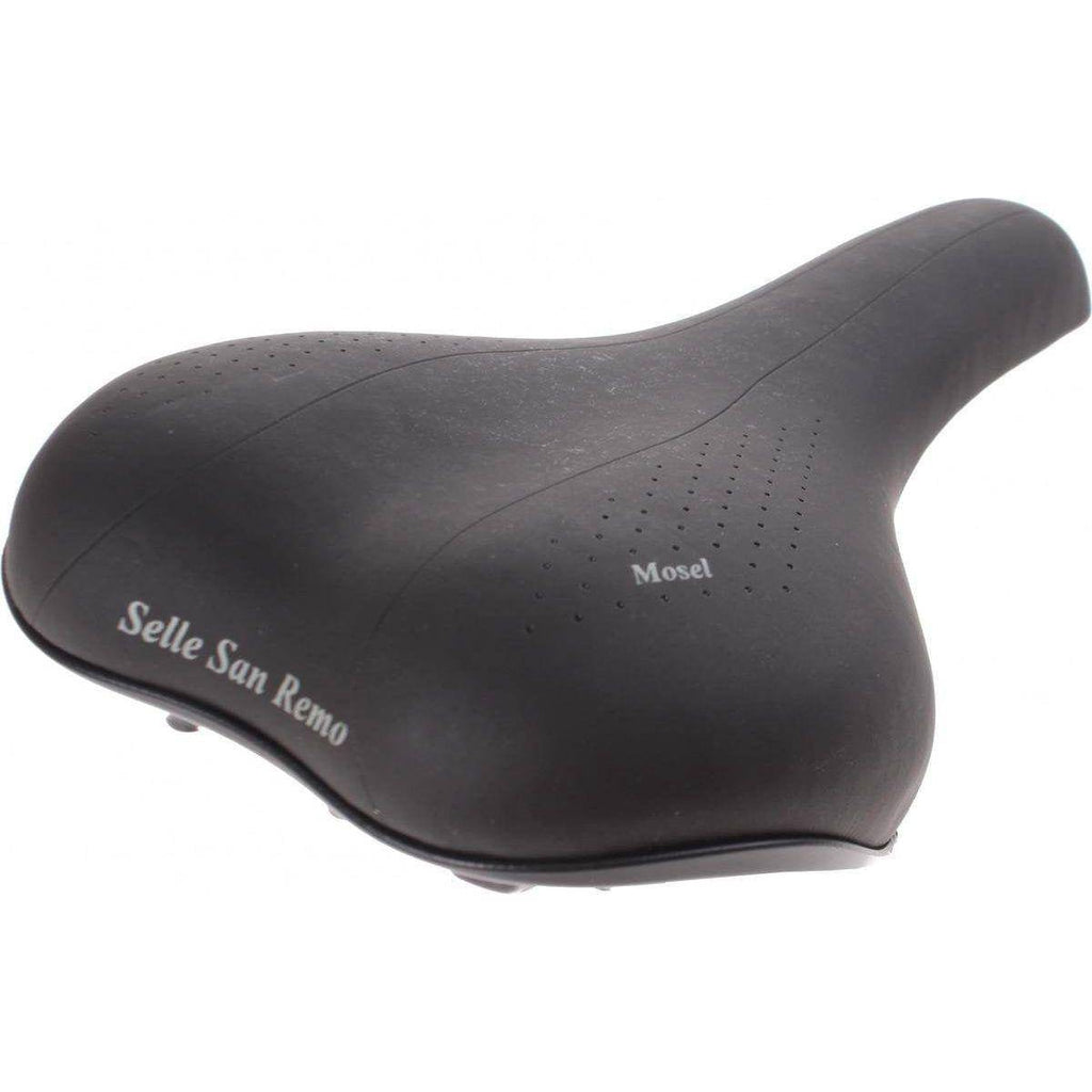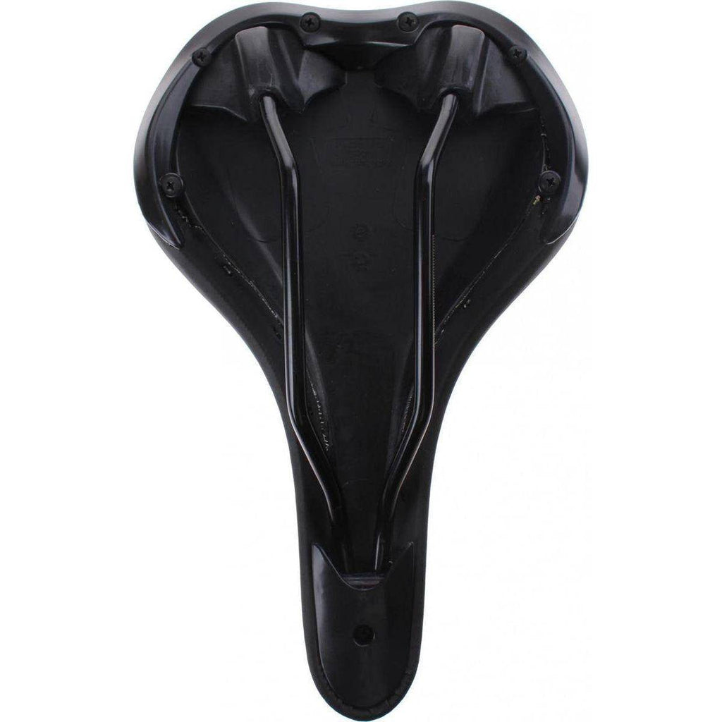 Selle de vélo de ville/randonnée dotée d'une couche supérieure en cuir PU noir de haute qualité recouvrant une couche de mousse hautement élastique, scellée sous vide pour former un ensemble solide et cohérent avec la base de la selle. Elle présente un imprimé sportif et un rail en acier noir ED. La selle est livrée sans collier de serrage.