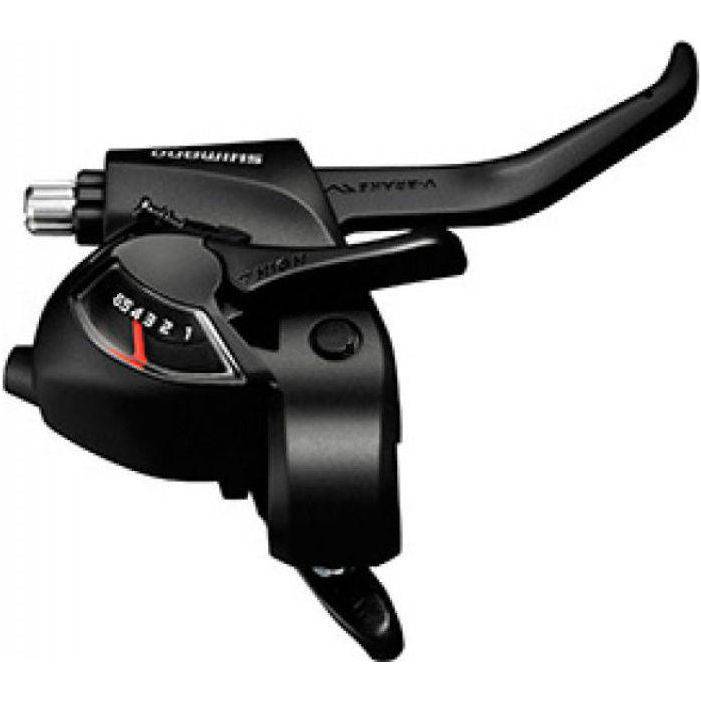 Model: ST-EF41 Hevel: 2 vingerig Aantal versnellingen: 6 speed Shifter hendel: Duimversteller Greepafstand instelbaar: Ja (met gereedschap) Remkabel instelbaar: Ja Schakelkabel instelbaar: Ja Open klemband: Nee Materiaal hevelL Resin Versnellingstype: EZ-Fire Plus Optisch schakelscherm: Ja Geschikt voor V-brake en mechanische schijfremmen MTB Inclusief binnenkabels