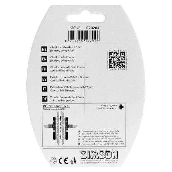 De Simson Remschoenen V-brake 72 mm zijn geschikt voor Shimano V-Brake remsystemen. De remschoenen zijn geschikt voor zowel voor- als achterrem. Draai met een inbussleutel de versleten remschoen los van de rem. Monteer de nieuwe remschoen met de inbussleutel in de juiste rijrichting, aan beide kanten even ver van de velg. De Simson Remschoenen worden geleverd per 2 stuks.