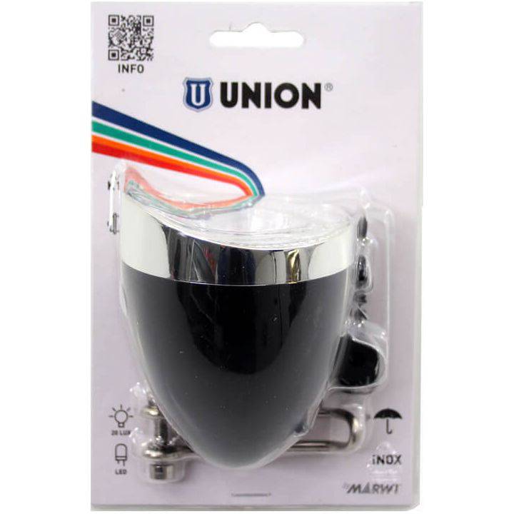 Union koplamp LED klassieke naafdynamo koplamp zwart, 20 Lux UN-4925 , aan/uit knop, 2+2 input en output aansluiting, Duitse StVZO goedkeur