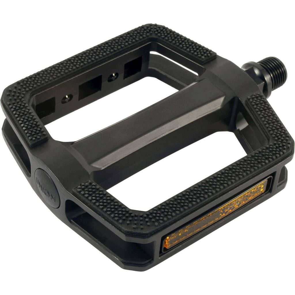 Pédales Union SP-180 en aluminium noir mat avec insert antidérapant, présentées sur carte.