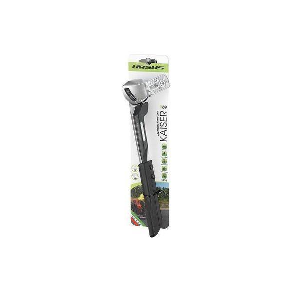 Béquille Ursus Kaiser, parfaitement adaptée aux vélos électriques. Convient aux tailles de roues 26" - 28". La béquille est réglable avec une clé Allen de 3 mm. Fixation sur la plaque de montage arrière du boîtier de pédalier. Livrée avec boulon Allen M8 x 20 mm. Inox. Haute stabilité. Très robuste. Matériau : Aluminium / Plastique. Dimensions de la plaque de montage : 50 x 29 mm. Longueur de l'axe de pivot au bout (version la plus longue) : 30 cm. Poids maximal : 55 kg. Poids : 555 grammes. Couleur : Argent.