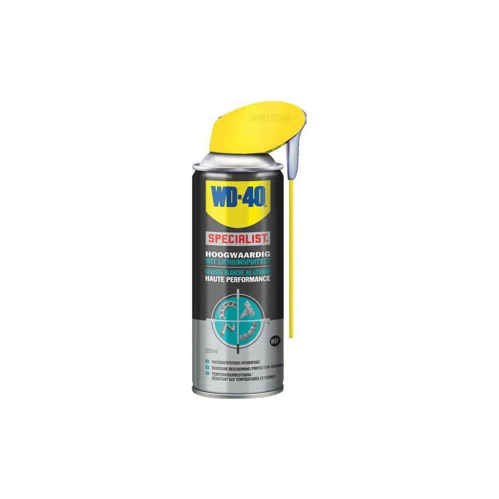 La graisse blanche au lithium en aérosol WD-40 Specialist est idéale pour les applications métal sur métal et les applications portantes nécessitant une lubrification et une protection intensives et durables. Elle peut être utilisée en extérieur, quelles que soient les conditions météorologiques. Sa formule épaisse et résistante à l'eau ne coule pas et reste donc en place, quelles que soient les conditions météorologiques. Elle est particulièrement efficace sur les mécanismes ou composants métal sur métal qui ne peuvent pas être lubrifiés régulièrement ou qui sont principalement situés à l'extérieur. Elle est idéale pour les barres de remorquage, les charnières de portières et les roulements. Elle est également idéale pour les outils de jardin, garantissant leur bon fonctionnement saison après saison. Utilisez notre graisse blanche au lithium en aérosol pour assurer le bon fonctionnement de vos outils et prévenir le grippage des mécanismes. Elle résiste à des températures de -18 °C à +145 °C. L'applicateur Smart Straw vous offre deux options de pulvérisation : large et précise. Relevez la paille pour une pulvérisation précise et abaissez-la pour traiter des zones plus étendues. Quelle que soit la façon dont vous préférez pulvériser, vous pouvez compter sur la valve intelligente à 360° qui vous permet de pulvériser à la verticale et à l'envers. CARACTÉRISTIQUES DU PRODUIT Assure une lubrification longue durée Ne coule pas et ne coule pas grâce à sa formule à haute viscosité Résistant à l'eau et à la chaleur, idéal pour une utilisation en extérieur Réduit la friction et l'usure Lubrifie les applications métal sur métal Fonctionne bien sous une pression extrême Smart Straw APPLICATIONS Lubrification des pivots de moteur Lubrification des chenilles et des guides Entretien des câbles et des chaînes Lubrification des pignons et des freins Entretien des loquets et des charnières Protection des outils de jardin contre la rouille et l'usure Assure le bon fonctionnement des roulements, des rouleaux et des bandes transporteuses