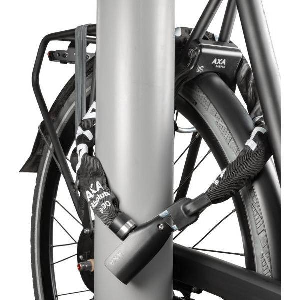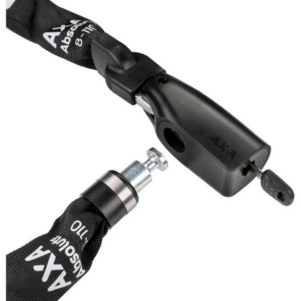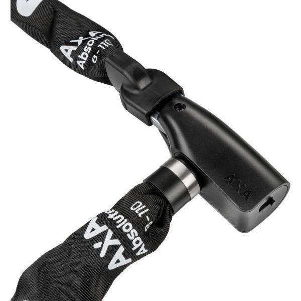 De Absolute is 110 cm lang, hierdoor kan je je fiets makkelijk aan een paal of hek vastmaken. Hij heeft een automatische click-in functie. Dit betekent dat je bij het afsluiten het uiteinde in de slotkop klikt. Je hoeft de sleutel niet te draaien om het slot te sluiten. De diameter van de gehard stalen schakels is 8 mm en de cilinder heeft een afdekkap. Dit houdt in dat de cilinder beschermd wordt tegen vocht en vuil zodat je langer plezier hebt van de ketting. Verder zit er een sterke polyester hoes om de ketting die ervoor zorgt dat er geen krassen op je fiets komen.