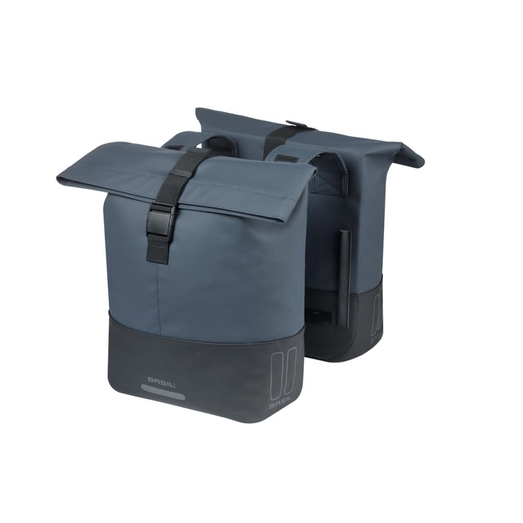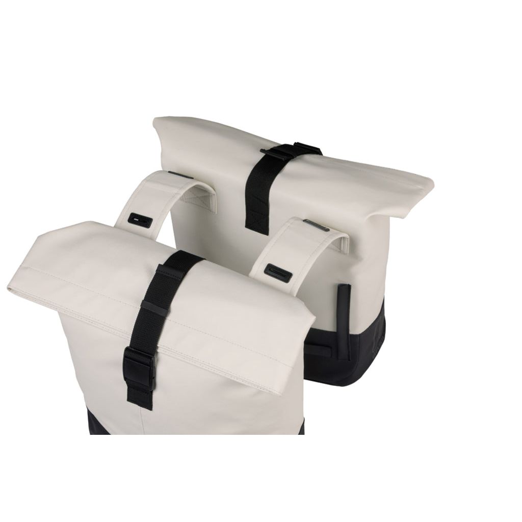 De Basil Cove dubbele fietstas combineert stijl, eenvoud en functionaliteit voor dagelijks gebruik. Met een inhoud van 28 tot 32 liter biedt de tas ruimte voor boodschappen, woon-werkverkeer of een dagje uit. Het cleane, tweekleurige ontwerp geeft een rustige, moderne uitstraling en past op vrijwel elke fiets. Dankzij het waterafstotende materiaal, vouwsluiting met gesp en stevige klittenband blijft de inhoud goed beschermd en de tas stabiel. Het Basil Universal Bridge-systeem maakt montage op vrijwel elke bagagedrager mogelijk, inclusief e-bikes. De tas is gemaakt van gerecycled PET met vegan leer en is volledig PFAS-vrij – duurzaam en klaar voor dagelijks gebruik.