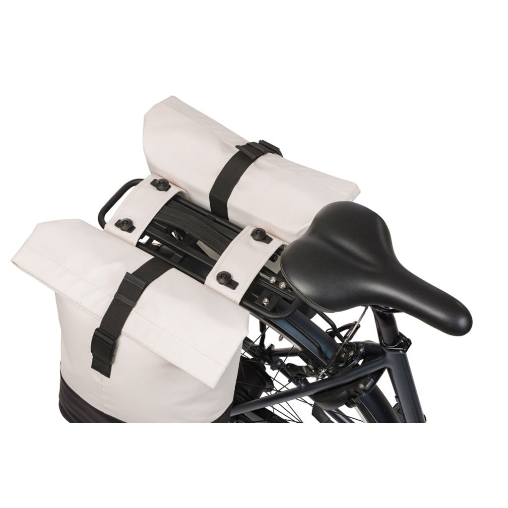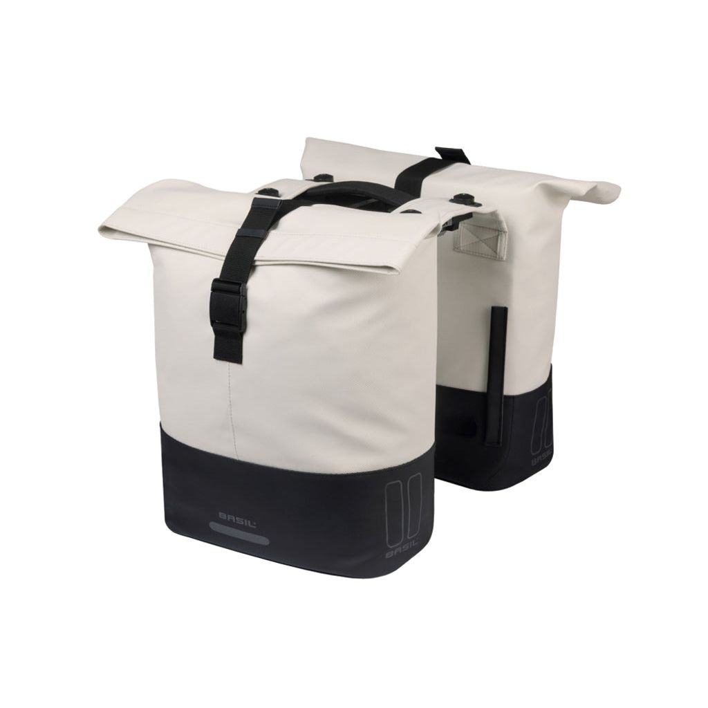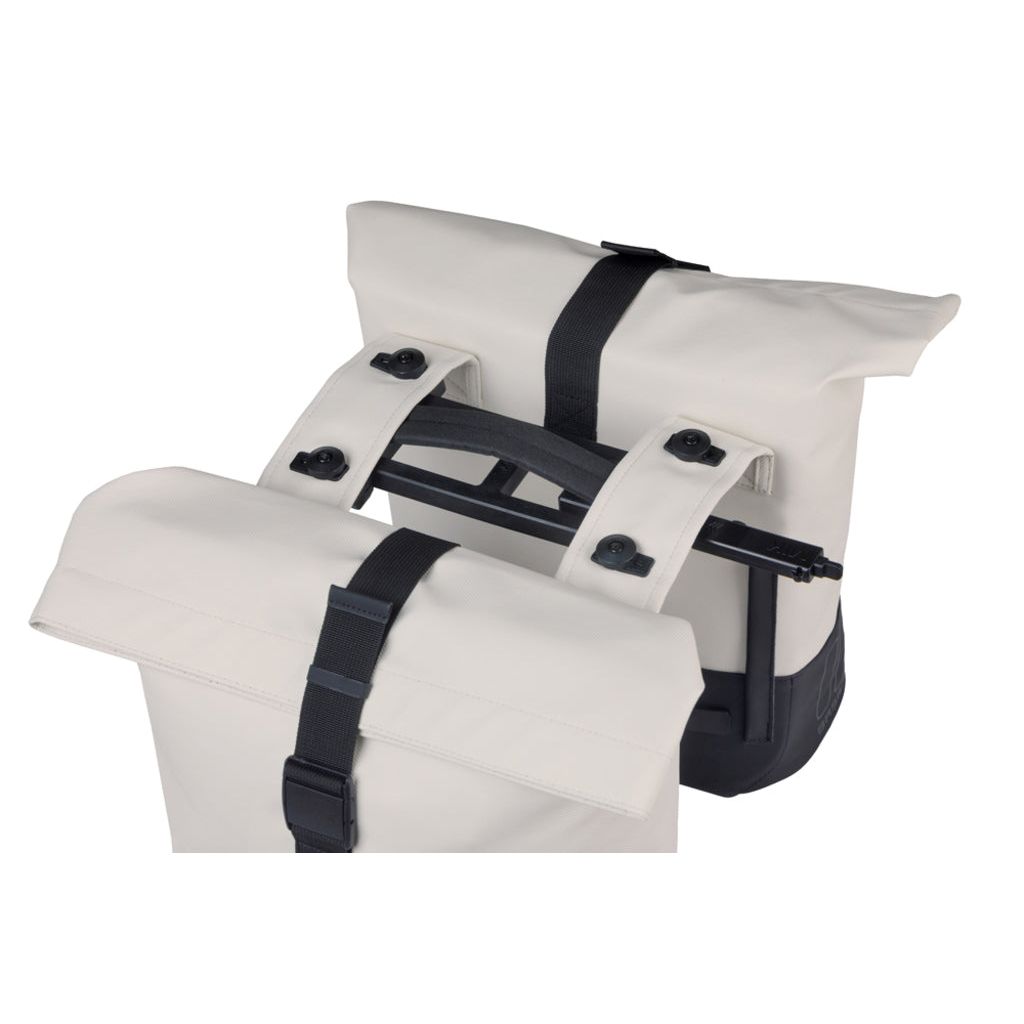 De Basil Cove dubbele fietstas combineert tijdloze stijl met praktisch gemak voor dagelijks gebruik. Met een inhoud van 28 tot 32 liter is de tas ideaal voor boodschappen, woon-werkverkeer of recreatief gebruik. Het strakke, uniseks ontwerp geeft elke fiets een rustige en moderne uitstraling. De tas is gemaakt van gerecycled PET met vegan leer, volledig PFAS-vrij en spatwaterdicht – duurzaam én weerbestendig. Dankzij de voorgemonteerde MIK-adapterplaat bevestig je de tas snel en veilig op een MIK-bagagedrager. De Cove is stabiel tijdens het fietsen, afneembaar en klaar voor intensief dagelijks gebruik in de stad of daarbuiten.