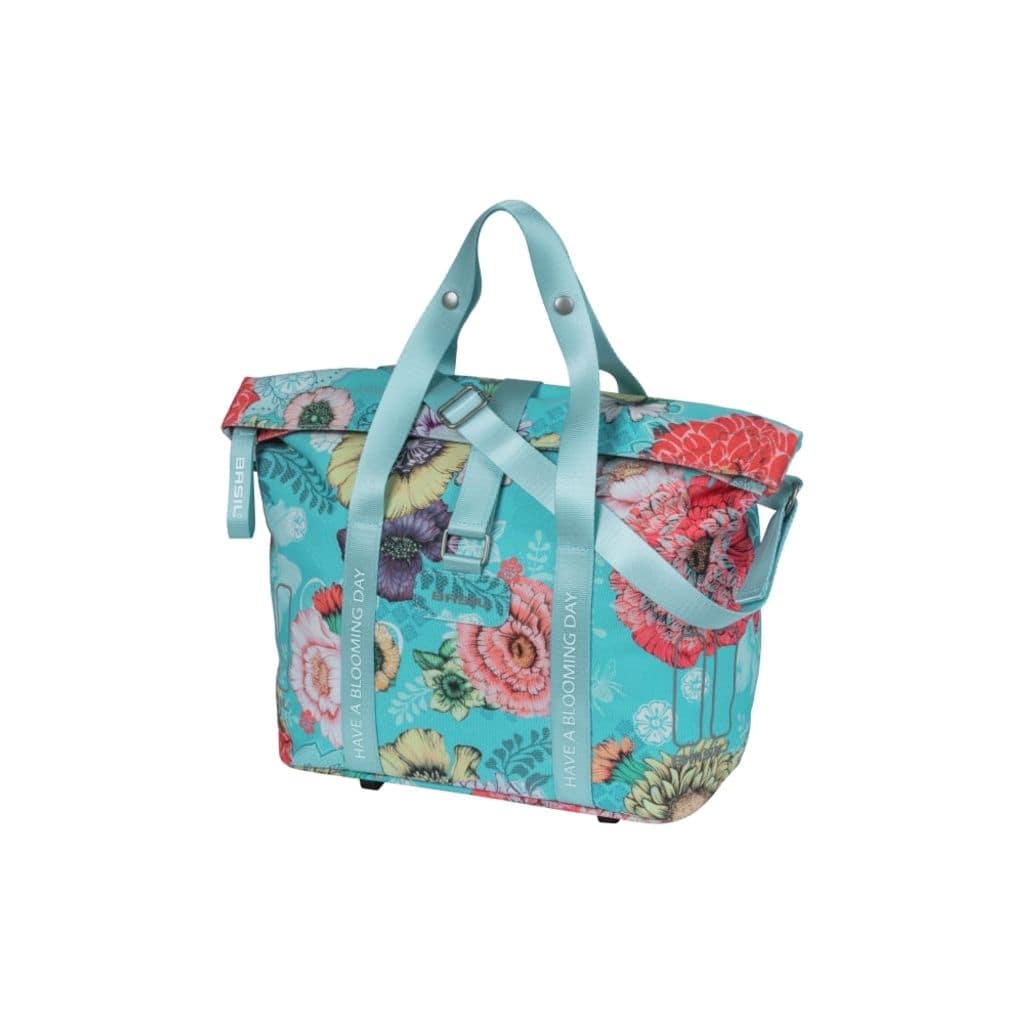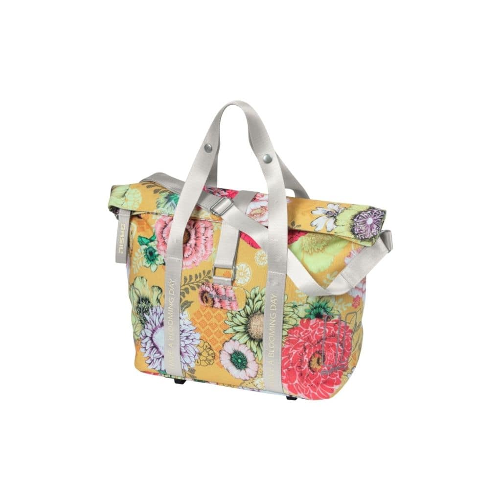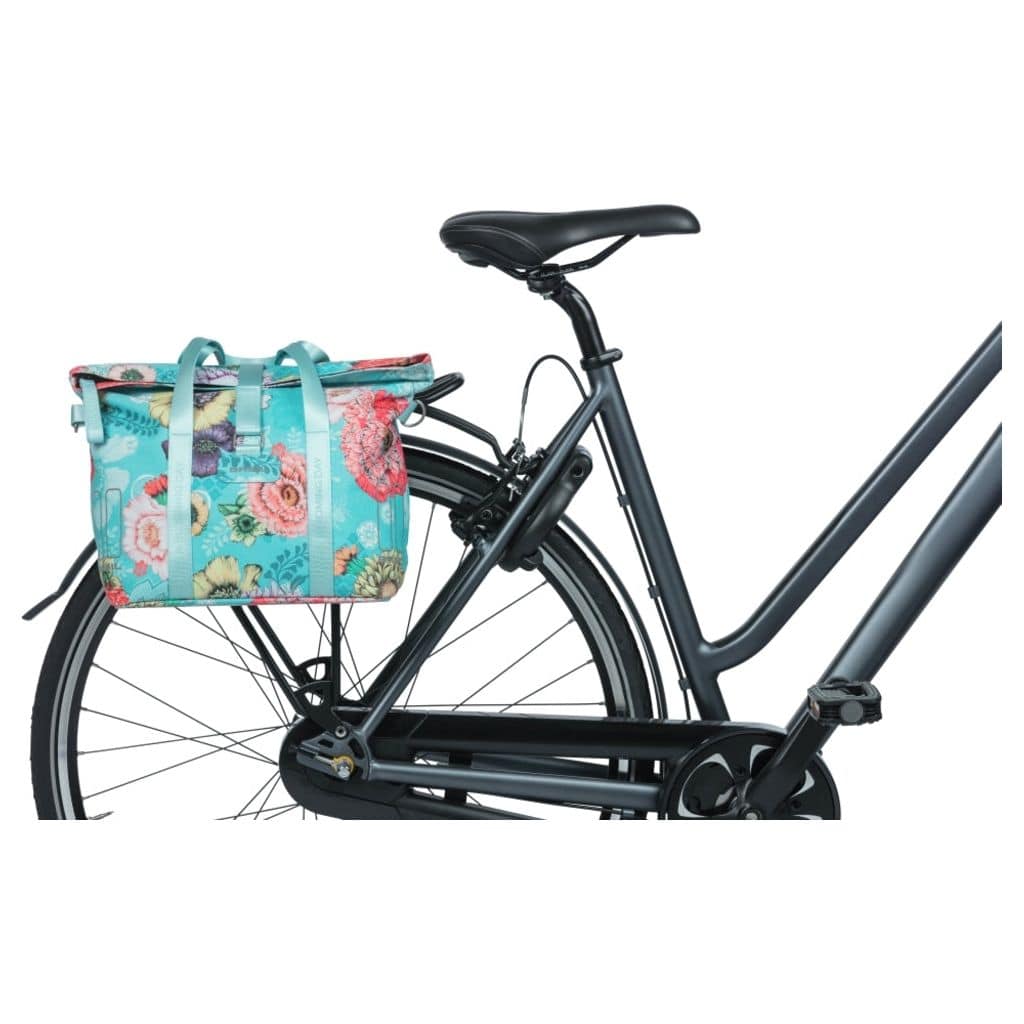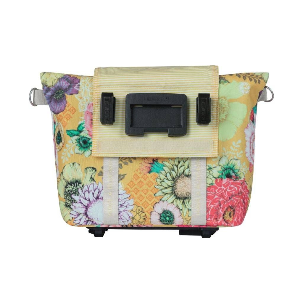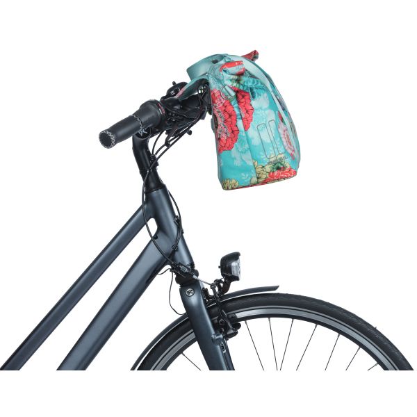 De Basil Bloom Field MIK is een opvallende en duurzame fietshandtas met handgeschilderde bloemenprint, gemaakt van gerecycled PET plastic. Ondanks zijn compacte formaat biedt de tas voldoende ruimte voor essentiële items zoals een portemonnee, sleutels en mobiel, met een gewatteerd vak voor een tablet in het hoofdvak. De tas is volledig waterdicht, zodat je waardevolle spullen veilig en droog blijven. De bevestiging aan de fiets kan op verschillende manieren worden gedaan, afhankelijk van je voorkeur. Je kunt de tas aan het stuur bevestigen met de voorgemonteerde KF-adapterplaat (apart verkrijgbaar), aan de bagagedrager met de voorgemonteerde haken, of met de voorgemonteerde MIK-adapterplaat.