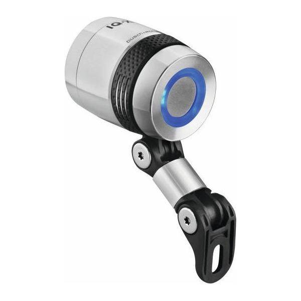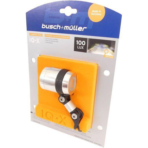 BUSCH & MÜLLER LED-koplamp Lumotec IQ-X met overdag fietslicht, 100 lux, met schakelaar voor naafdynamo, met inschakelautomaat door licht-donker-sensor, met standlichtfunctie, aluminium, extreem goede en homogene IQ-X-lichtbundel naar voren en de zijkanten, met alu koeling behuizing, met bijgevoegde, opschroefbare reflector, extra LEDs voor lichtstralen naar de zijkant zorgen voor nog meer veiligheid, AAN/UIT-knop is blauw verlicht, speciale houder met gewrichten en met geïntegreerde kabelvoering voor montage op de voorvork Overdag fietslicht: naar voren uitgerichte signaal-LEDs. De senso-automaat schakelt bij licht automatisch op maximaal overdag fietslicht, in het donker op maximaal fietslicht. Technische voorwaarde: een naafdynamo - loopt altijd en daardoor is stroom probleemloos beschikbaar. StVZO toegelaten: altijd - ook in de overdag-modus, omdat de gedimde hoofdkoplamp voldoet aan de eisen van de StVZO (Duits keurmerk). Standlicht: automatisch. De speciale LEDs overnemen doelgericht de veiligheids-status.