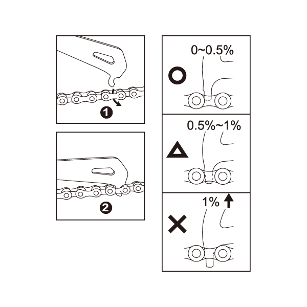 Eigenlijk is een kettingslijtagemeter een heel eenvoudig apparaatje, maar het werkt wel! Je steekt de kettingslijtagemeter aan de ene kant tussen een schakel, en aan de andere kant valt de punt dan automatisch tussen twee andere kettingschakels. Hoe verder de ketting versleten is hoe verder de schakels uit elkaar staan. Er ontstaat dus meer ruimte tussen de schakels. Dit wordt gemeten door de kettingslijtagemeter. Valt de punt volledig tussen de schakels dan mag je per direct op zoek naar een nieuwe ketting. Je huidige ketting is dan versleten.