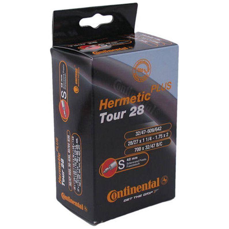 Deze binnenband zorgt voor minder onderhoud en meer zekerheid! Hermetic Plus is een speciale rubbersamenstelling die verwerkt wordt in een binnenband, de grote voordelen zijn daarmee minder onderhoud(minder pompen) doordat de binnenband tot 3 x langer op druk blijft in vergelijking met een standaard binnenband en daarnaast is het rubber veel sterker waardoor de kans op lekrijden zeer verkleind wordt. Met deze 2 feiten is de binnenband een welkome aanvulling voor elke buitenband, natuurlijk geldt dit voornamelijk voor de stads en trekkingfietsen maar er springt nog 1 doelgroep naar voren waar een 3e voordeel naar boven komt Namelijk de E-bikes! Deze fietsen hebben een beperkte actieradius en daar heeft juist de bandenspanning ook een enorme invloed op, wanneer men de Hermetic Plus binnenband laat monteren behoudt men veel langer de druk in de banden waardoor dit een positief effect kan hebben op de actieradius, dat meegenomen met het feit van minder pompen en meer zekerheid tegen lekrijden is dit een ideale binneband voor elke E-bike! Productspecificaties: Soort artikel: binnenband Inch wielmaat: 28" Soort ventiel: Blitz/Dunlop/Hollands Lengte ventiel: 40 mm Diameter ventiel: ø8.5 mm Kleur: zwart Gewicht: 240 gram Bandenmaat: 32-622 / 28 x 1 5/8 x 1 1/4 37-622 / 28 x 1 5/8 x 1 3/8 40-622 / 28 x 1.5 47-622 / 28 x 1.75 32-630 / 27 x 1 1/4 37-635 / 28 x 1 3/8 40-635 / 28 x 1 1/2 42-635 / 28 x 1 1/2