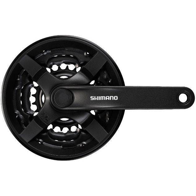 SHIMANO TOURNEY TY - MTB-crankstel - Q-Factor van 181,5 mm - 3x8/7/6-versnellingen De SHIMANO TOURNEY TY Crank, compatibel met aandrijvingen voor 3x8-, 3x7- en 3x6-versnellingen, levert betrouwbare, precieze DUAL SIS-schakeling. Kenmerken: Licht en betrouwbaar schakelen Nauwkeurig geïndexeerd schakelsysteem DUAL SIS Veelzijdige prestaties Brede uitwisselbaarheid met meerdere onderdelen Snelle en nauwkeurige montage Productspecificaties Merk: Shimano Shimano groep: SHIMANO Shimano groepscode: TY301 Shimano modelcode: FC-TY301 Cranklengte: 170 mm Vertanding: 42-34-24T Aantal armen: 4-arm Aantal kettingbladen: Triple Aantal versnellingen: 8/7/6 Kettingbeschermer: Met kettingbeschermer Kettinglijn: 47.5/47.5 + t/50 mm Materiaal: staal Geschikt voor vierkante trapas Aanbevolen trapas met schroefdraad (normaal): BB-UN101, BB-UN300 Aanbevolen trapas met schroefdraad (kettingbeschermer): BB-UN101-K, BB-UN300K Vorkafstand steekas (mm): 142 Vorkafstand QR/moer (mm): 135 BCD (mm): Geklonken Q-factor (mm): 181,5 Kleur: zwart