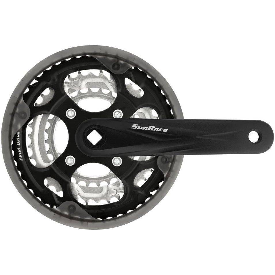 Productspecificaties: Merk: SunRace Type: FCM300 Geschikt voor: stadfiets Materiaal cranks: aluminium Materiaal kettingblad: staal Aantal kettingbladen: 3 Vertanding: 28-38-48 Offset: -4mm Type as: vierkante aansluiting (JIS) Gewicht: 1107 gram Asmaat pedalen: 9/16" Kleur: zwart/zilver