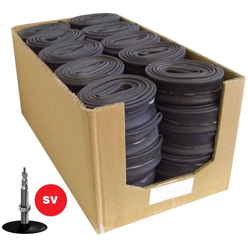 50 binnenbanden van in werkplaats voordeelverpakking. Product Specificaties: Ventiel: Frans ventiel 40mm (Sclaverand) Geschikt voor onderstaande bandenmaten: 40-584 - 27.5 x 1.50 - 650B 47-584 - 27.5 x 1.75 - 650B 50-584 - 27.5 x 2.00 - 650B 54-584 - 27.5 x 2.10 - 650B 57-584 - 27.5 x 2.25 - 650B 60-584 - 27.5 x 2.35 - 650B 62-584 - 27.5 x 2.40 - 650B 44-584 - 27.5 x 1.65 - 650 x 42B 40-609 - 27 x 1 1/2 40-635 - 28 x 1 1/2 - 700 x 38B 42-635 - 28 x 1 1/2 44-635 - 28 x 1 5/8 x 1 1/2 - 700 x 40/42B 46-635 - 28 x 1.80 48-635 - 28 x 1.90 50-635 - 28 x 2.00 54-635 - 28 x 2.10 56-635 - 28 x 2.20 58-635 - 28 x 2.30 60-653 - 28 x 2.35 40-622 - 28 x 1.50 - 700 x 38C 42-622 - 28 x 1.60 - 700 x 40C 47-622 - 28 x 1.75 - 700 x 45C 50-622 - 28 x 2.00 60-622 - 28 x 2.35 40-635 - 28 x 1 1/2 - 700 x 38B 57-622 - 28 x 2.25 55-622 - 28 x 2.15 57-622 - 29 x 2.25 47-622 - 29 x 1.75 - 700 x 45C 50-622 - 29 x 2.00 62-622 - 29 x 2.40 54-622 - 29 x 2.10