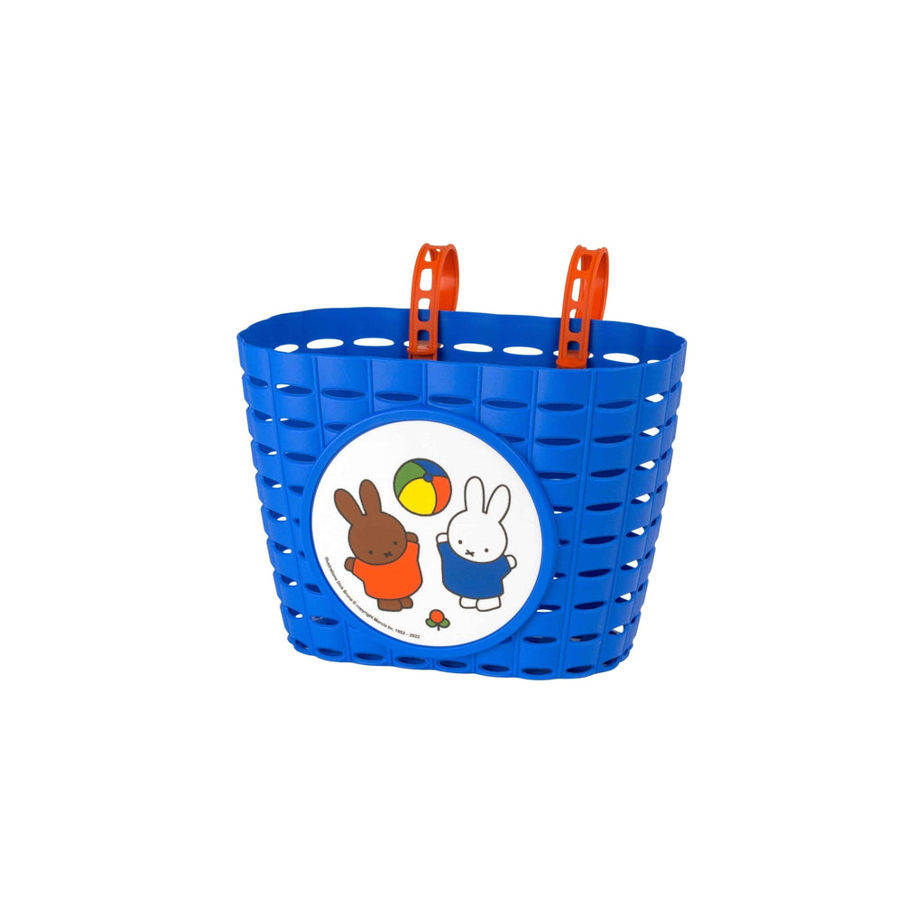 Vrolijke, blauwe mandjes met nijntje bal sticker die heel eenvoudig aan de fiets kunnen worden gemonteerd. In rood en blauw