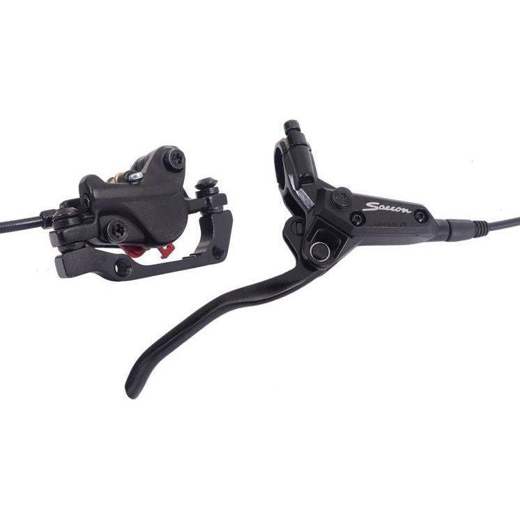 Hydraulische rechter remset van Saccon. Model: DH56 Reeds afgevuld en ontlucht Lengte remleiding: 1600 mm Bevestiging: Postmount of IS2000 Geleverd inclusief remblokjes