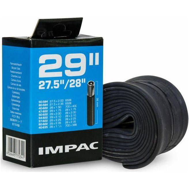Binnenband van Impac, geproduceerd door Schwalbe. Geleverd in kartonnen winkelverpakking. Specificaties: Ventiel: Autoventiel 40mm Geschikt voor onderstaande bandenmaten: - 50-584, 27.5x2.00", 650B - 60-584, 27.5x2.35", 650B - 47-622, 29x1.75", 28x1.75" - 50-622, 29x2.00", 28x2.00" - 54-622, 29x2.10" - 57-622, 29x2.25" - 60-622, 29x2.35" - 40-365, 28x1 1/2"