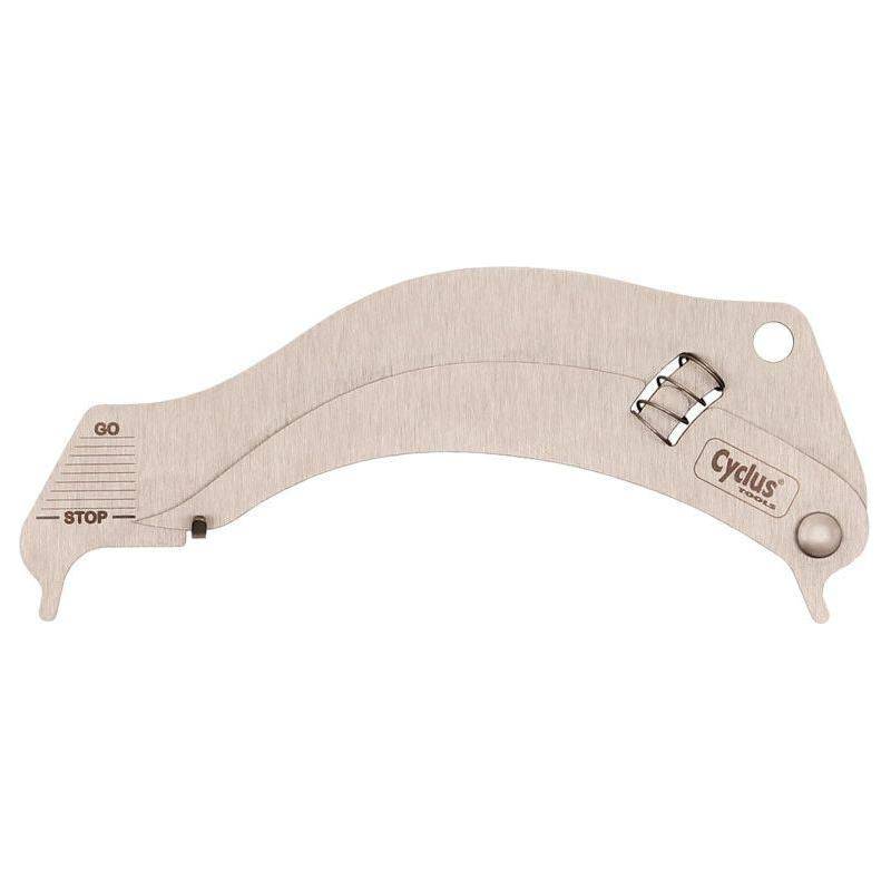 De ketting is een van de essentiële onderdelen van je fiets. Met deze kettingslijtagemeter van Cyclus houd je in de gaten of hij al aan vervanging toe is! Je plaatst hem tussen de schakels en de hefboom zal zich bewegen tot een van de niveaus die op de meter aangegeven zijn. Hiermee kun je dan op schaal beoordelen of de ketting versleten is of nog lang mee gaat! Gebruik: 1. Plaats de slijtagemeter als eerst met de linkerzijde (met de maatniveaus) op een binnenschakel van de ketting. Vervolgens plaats je ook de rechterzijde tussen een binnenschakel. 2. Nu kun je zien of de wijzer aan de hefboom boven- of onderaan de meter staat. Dit geeft een globale indicatie van hoe ver de ketting versleten is. Staat hij bovenaan de meter, dan is de ketting nog niet echt versleten. Hoe verder de wijzer naar onderen staat, des te meer de ketting versleten is. Staat hij helemaal onderaan, dan is hij écht aan vervanging toe. Specificaties Slijtagemeter voor fietskettingen Kan gebruikt worden bij schakelkettingen en singlespeed kettingen van 1/2 x 1/8 Meet de slijtage over 11 schakels Globale, indicatieve meting zonder concrete waarden