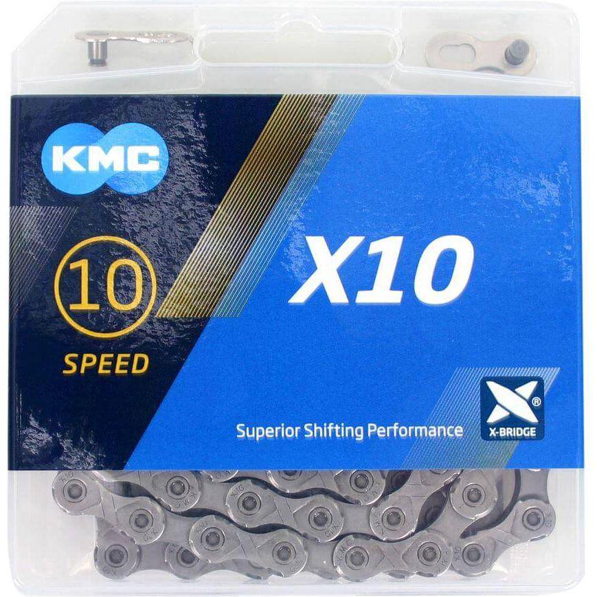 KMC X10 Grijs kettingOpvolger van de X10-73 De ketting heeft een Xtreem stretch proof behandeling ondergaan. Hierdoor komt er minder snel rek op de schakels, waardoor vuil niet snel tussen de schakels kan komen. Deze ketting is daarom zeer geschikt voor de zwaardere weersomstandigheden.Alle KMC kettingen zijn door de bijgeleverde 'missinglink' eenvoudig met de hand te monteren en te demonteren. Ook voor ATB.KMC kettingen staan bekend als het meest hoogwaardige ketting ter wereld. KMC X10 Grijs- Compitabel voor alle Shimano, Campagnolo en SRAM 10 Speed COMPACT groepen.- Inclusief silver missing link- 114 kettingschakels- Licht gewicht: slechts 259g- Snel schakelen- Eenvoudig demonteren en monteren- Slijtvast