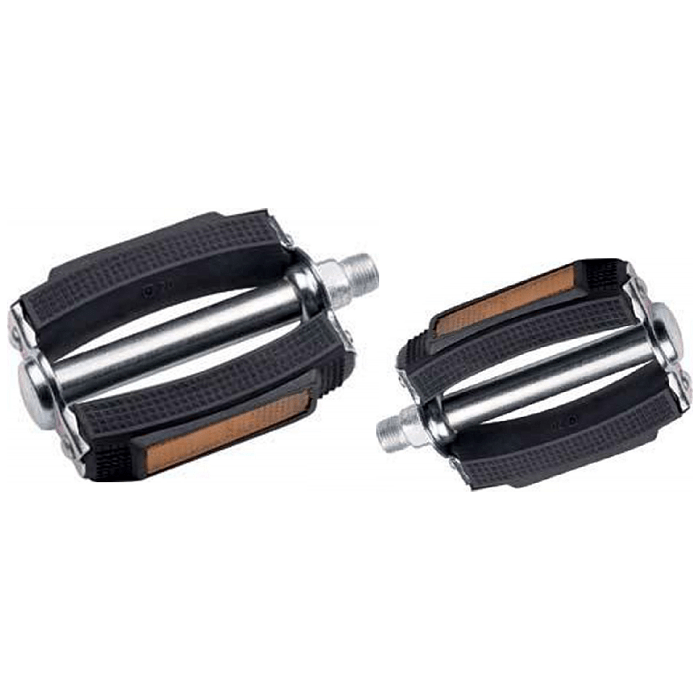 Pedaalset Marwi 677H met reflectoren - zilver/zwart (werkplaatsverpakking) Merk: Marwi Type: 677H Pedaalas: dikke draad 9/16 inch met reflectoren Kleur: zilver/zwart Type verpakking: werkplaatsverpakking