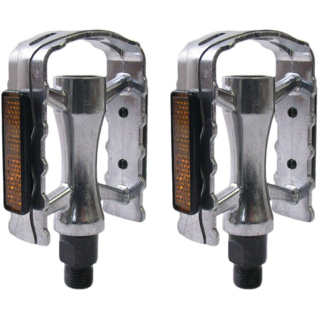 Pedaalset Marwi SP-610 aluminium - zilver (werkplaatsverpakking) Body: aluminium uit één stuk Kooi: aluminium As: boorstaal of koolstofstaal Lager: instelbaar baltype Reflector: goedgekeurd of niet goedgekeurd Afmeting: 105 x 81 mm Gewicht: 374 gram/paar