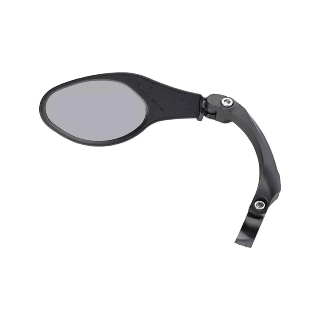 Mirage fietsspiegel de luxe draaibaar + klem op kaart. Kleur zwart. De spiegel is van onbreekbaar glas en verweerd niet. Behuizing en steun zijn van hoogwaardig kunstof. De bouten en metalen onderdelen zijn roestvrij. Voorzijde is voorzien van een reflector. Makkelijk instelbaar voor elke hoek. Aanbevolen voor gebruik bij hoge snelheden o.a.:race- of E-bikes/electrische fietsen. Met deze spiegel krijg je direct een goed beeld van het verkeer achter je. De spiegel bevestig je eenvoudig aan de linker binnenkant van het stuur. De spiegelarm klapt weg bij een botsing en heeft op de achterzijde een reflector zitten, zodat je ook in het donker altijd goed zichtbaar bent.